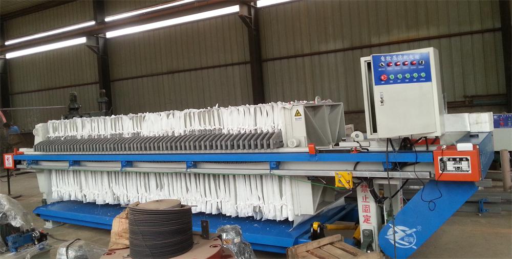 濾布單行走式自動廂式壓濾機(jī)工作時料漿從頂部進(jìn)料口送入,經(jīng)過進(jìn)料、壓榨、洗滌、吹風(fēng)干燥后,油缸啟動,將各濾室同時打開。濾布包著濾餅向下行走,濾餅很容易從濾布上卸除,同時高壓水對濾布進(jìn)行清洗。整個過程能自動實現(xiàn),大大節(jié)省了人力操作。