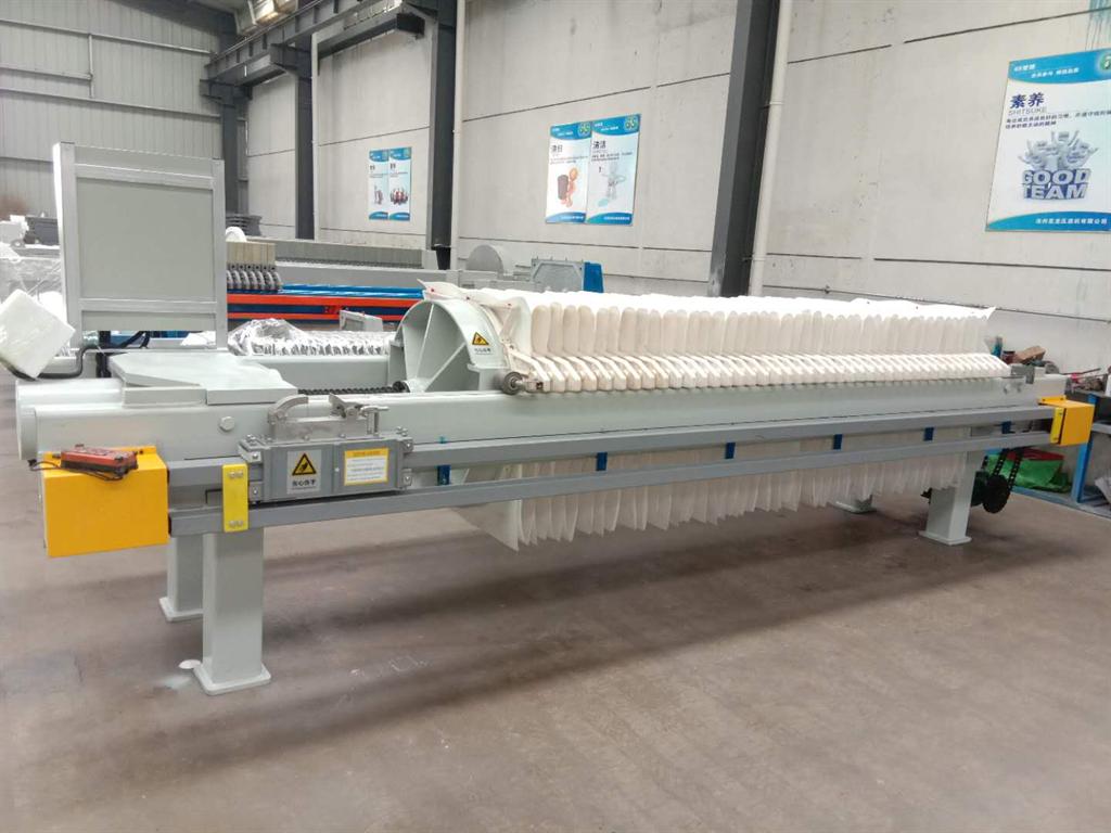 廂式壓濾機在輸料泵的壓力作用下,將過濾物輸送到各濾室內,通過過濾介質將固體和液體分離。廂式壓濾機濾室有一塊平板濾板和一塊中空的濾框組成,濾布固定在板框上的,這是早期主要壓濾機形式,而廂式壓濾機的濾室是由相鄰兩塊凹陷的濾板構成,主要優(yōu)點是_換濾布方便,缺點是效率低、過濾效果不好、濾板容易壞。在濾布上形成濾渣,慢慢積累形成濾餅。濾液穿過濾布并沿濾板溝槽流至下方出液孔通道,集中排出。過濾完畢,可通入清洗滌水洗滌濾渣。洗滌后,有時還通入壓縮空氣,除去剩余的洗滌液。過濾結束后打開壓濾機卸除濾餅,清洗濾布,重新壓緊板濾開始下一工作循環(huán)。